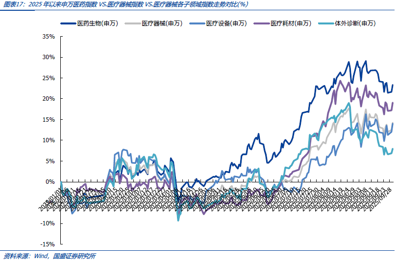 2025年初至今申万医药指数上涨23.36%,医疗器械指数上涨14.23%,医疗设备指数上涨14.02%,医疗耗材指数上涨19.07%,体外诊断指数上涨7.97%。医疗设备指数跑输医药指数9.34%,耗材指数跑输医药指数4.29%,体外诊断指数跑输医药指数15.39%。
