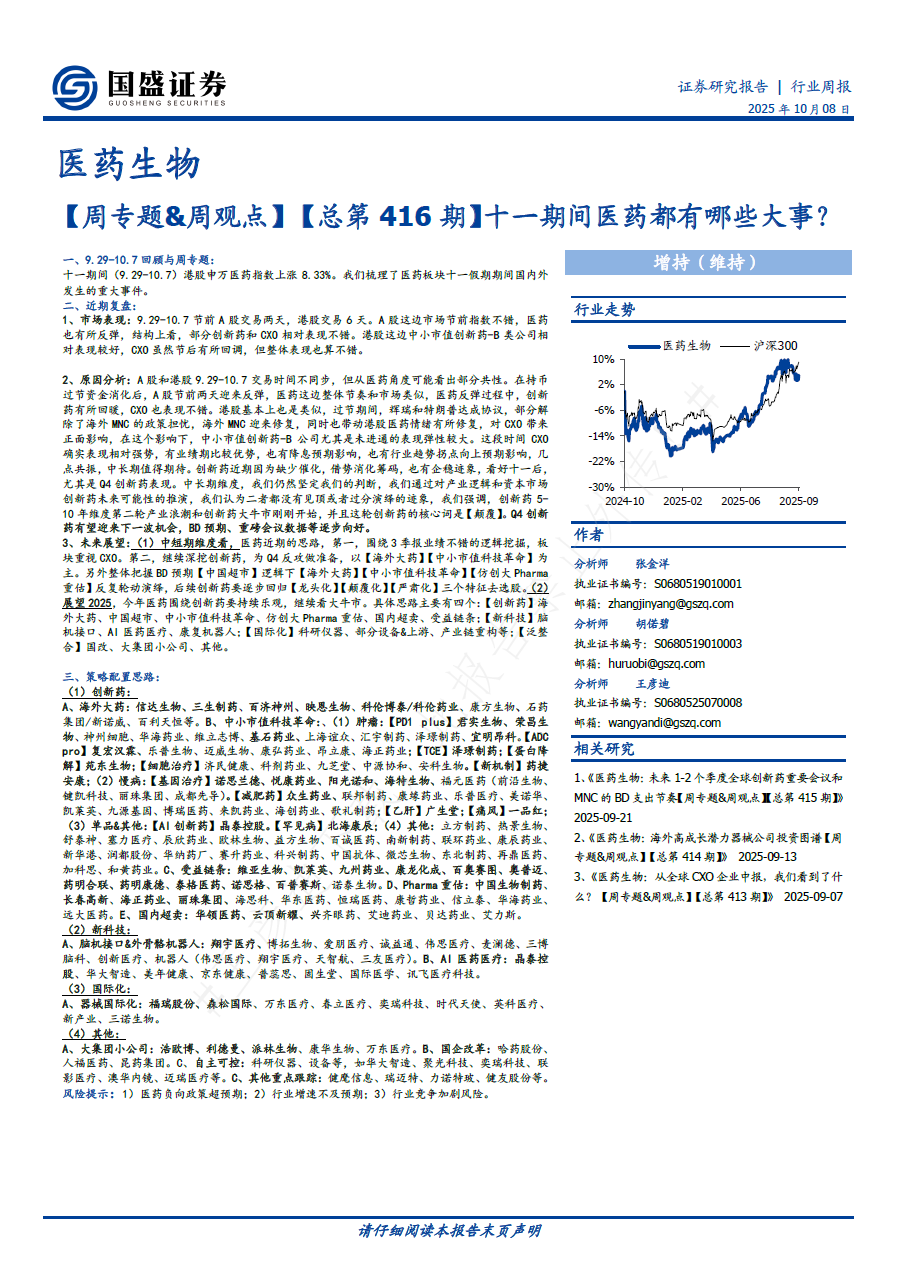 本文节选自国盛证券研究所于2025年10月8日发布的报告《【周专题&周观点】【第 416期】十一期间医药都有哪些大事?》,具体内容详见相关报告。