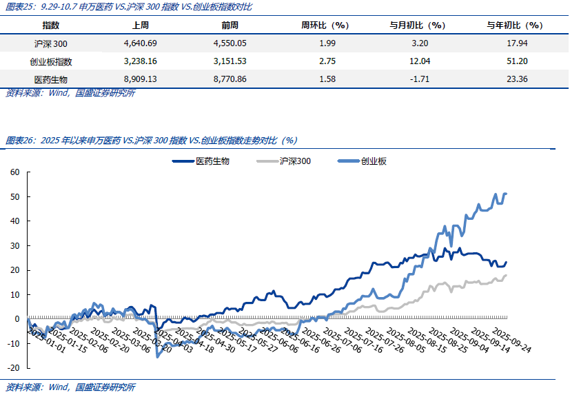 上周(9.29-9.30)申万医药指数环比+1.58%,跑输创业板指数,跑输沪深300指数。上周申万医药指数周环比+1.58%,沪深300指数周环比+1.99%,创业板指数周环比+2.75%,医药跑输沪深300指数0.42个百分点,跑输创业板指数1.17个百分点。2025年初至今申万医药上涨23.36%,沪深300上涨17.94%,创业板指数上涨51.20%,医药跑输沪深300指数,跑输创业板指数。