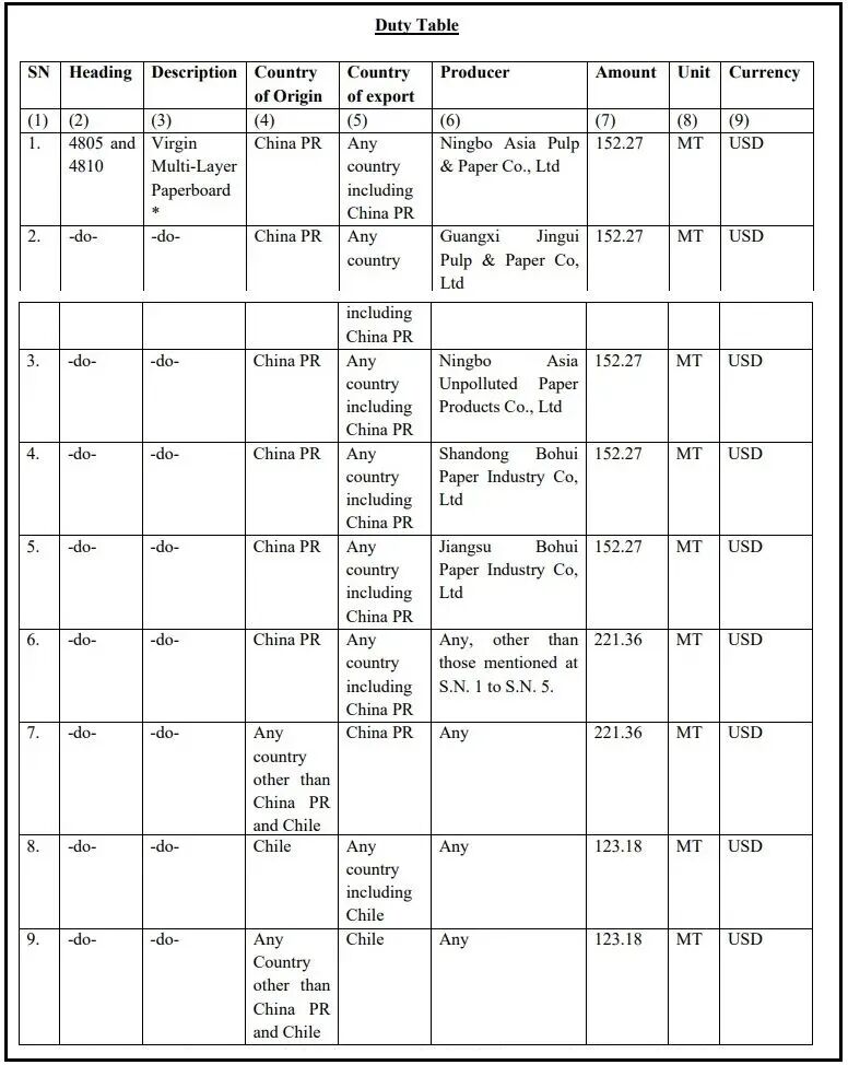2025年9月29日,印度商工部发布公告,对原产于或进口自中国和智利的原生多层纸板(Virgin Multi-layer Paperboard)作出反倾销肯定性终裁,建议对上述国家的涉案产品征收为期5年的反倾销税,具体如下:中国涉案生产商宁波亚洲浆纸业有限公司(Ningbo Asia Pulp & Paper Co., Ltd.)、广西金桂浆纸业有限公司(Guangxi Jingui Pulp & Paper Co, Ltd.)、宁波亚洲绿色纸品有限公司(Ningbo Asia Unpolluted Paper Products Co., Ltd.)、山东博汇纸业股份有限公司(Shandong Bohui Paper Industry Co, Ltd.)、江苏博汇纸业有限公司(Jiangsu Bohui Paper Industry Co, Ltd.)的反倾销税均为152.27美元/吨,中国其他生产商的反倾销税为221.36美元/吨;智利生产商的反倾销税为123.18美元/吨。涉案产品是由白色/原生木浆制成的多层纸板,无论是涂层还是未涂层,包括140至450GSM之间的折叠箱板(FBB)、固体漂白硫酸盐板(SBS)、杯状纸或纸板和液体包装纸板。本案涉及印度海关编码4805和4810项下的产品。