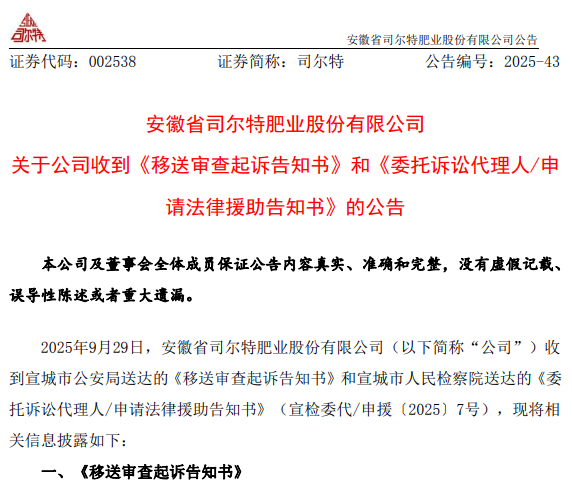 2025年9月30日,深交所主板上市公司司尔特(002538.SZ)公告称,公司收到宣城市公安局送达的《移送审查起诉告知书》及检察院相关文书(详见后文)。据公告,该公司前任董事、高级管理人员、部分员工及相关证券中介机构人员因涉嫌职务侵占、虚开增值税专用发票、诈骗等多项犯罪,被宣城市公安局移送审查起诉。