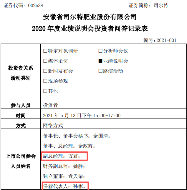 据司尔特此前发布的2020年度业绩说明会投资者问答记录表,被起诉的人员中,方君为该公司副总经理(曾任公司财务总监、董秘),孙彬为该公司保荐代表人。