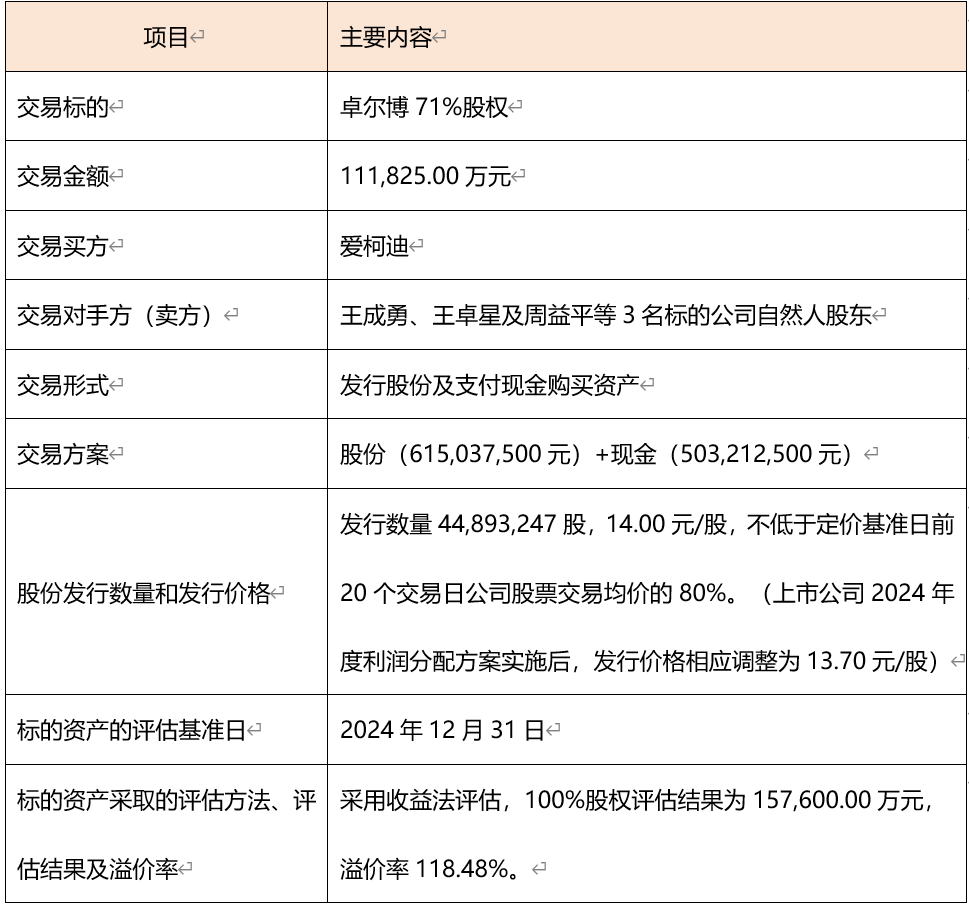 本次交易,爱柯迪拟通过发行股份及支付现金的方式向王成勇、王卓星及周益平等3名交易对方购买其合计持有的卓尔博71%股权,同时拟向不超过35名特定投资者发行股份募集配套资金。交易作价11.18亿元。
