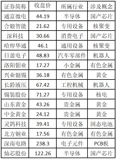 从涨势强度来看,涨停板个股中,股价创出历史新高的个股共有15只,包括通富微电、合锻智能、深科技、哈焊华通、日盈电子、洛阳钼业、兴业银锡、长龄液压、锡装股份、山东黄金、中金黄金、灵鸽科技、北方铜业、深南电路、灿芯股份。欢迎大家关注微信公众号“道达号”,“道达涨停复盘”栏目为大家复盘市场涨停数据。