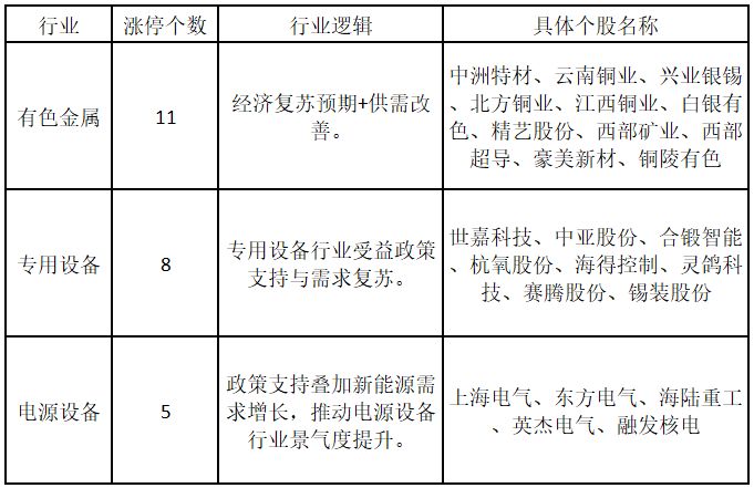 从行业特征来看,今日涨停板个股中,有色金属、专用设备、电源设备行业的个股最多。