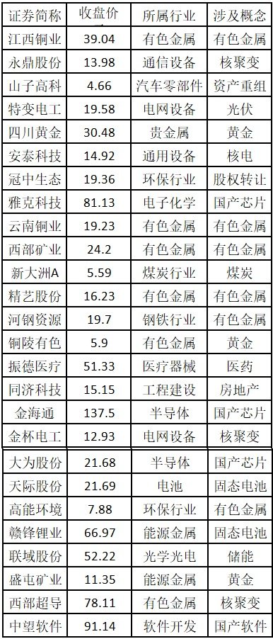 涨停板个股中,股价创出近一年新高的个股有26只(不包括创出历史新高的个股),包括江西铜业、永鼎股份、山子高科、特变电工、四川黄金、安泰科技、冠中生态、雅克科技、云南铜业、西部矿业、新大洲A、精艺股份、河钢资源、铜陵有色、振德医疗、同济科技、金海通、金杯电工、大为股份、天际股份、高能环境、赣锋锂业、联域股份、盛屯矿业、西部超导、中望软件,具体如下表所示。