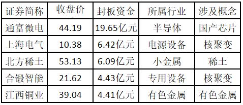 从封板资金来看,今日涨停板个股中,封板资金排名前5的个股包括通富微电、上海电气、北方稀土、合锻智能、江西铜业。欢迎大家关注微信公众号“道达号”,“道达涨停复盘”栏目为大家复盘市场涨停数据。