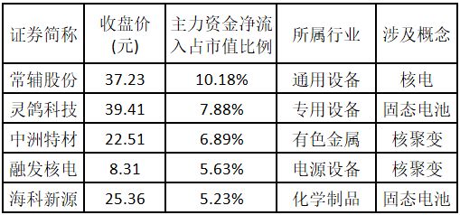 主力资金净流入金额占市值比例排名前5的个股分别为常辅股份、灵鸽科技、中洲特材、融发核电、海科新源。