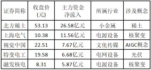 从主力资金来看,今日涨停板个股中,主力资金净流入金额排名前5的个股分别为北方稀土、上海电气、视觉中国、特变电工、融发核电。
