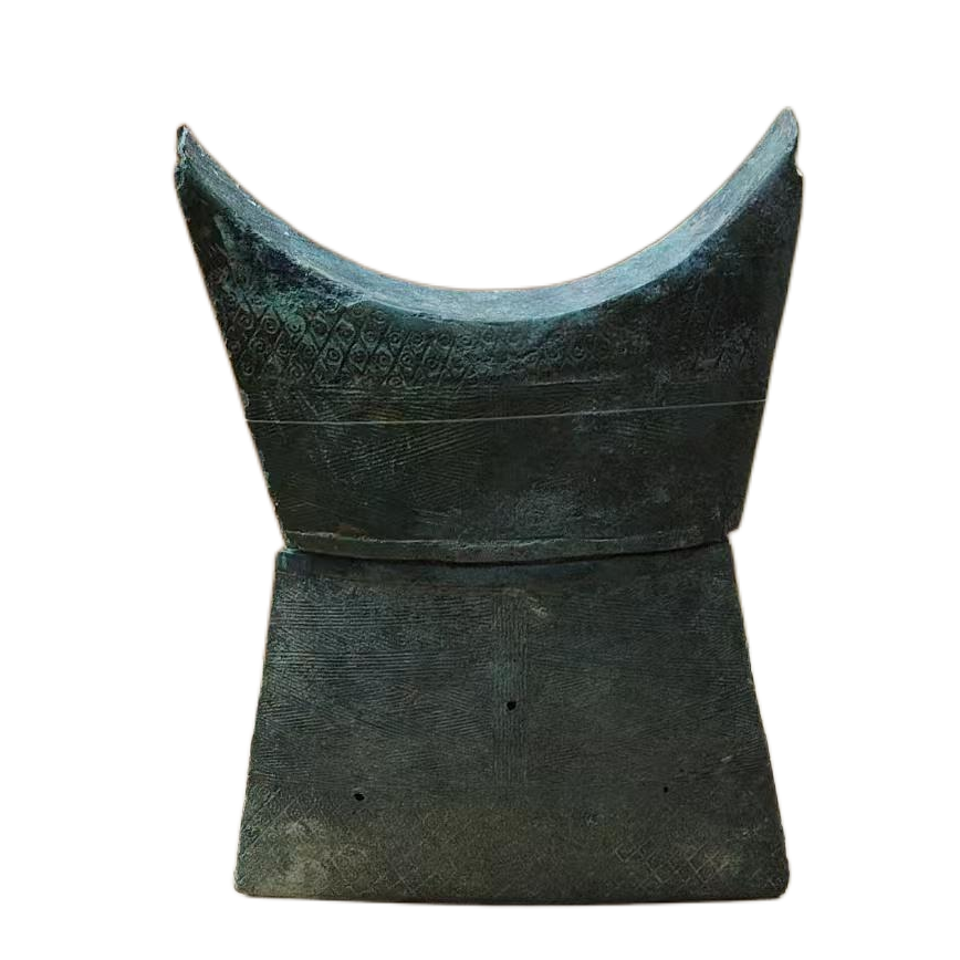 山字足铜案是哀牢地区最具特色的器物之一,由案面、支架组成;案面两端宽,中间窄且微凹,四角微上翘,呈弧形;案面下前后两侧连接对称山字形支架,支架间有两横档固定;案面饰 12 组对称涡纹和云雷纹,四角饰羽纹,边缘饰锯齿纹;支架饰菱形纹及云雷纹。铜盒造型别致,内部空心,由盖与器身巧妙扣合而成,盖部呈现出马鞍的形状,器身截面呈现梯形,盖与器身都精心装饰着多重斜线、菱形和圆形纹样,盖正面中央、器身正面底部及两侧,均铸有一个带有孔洞的环钮。案是古代人盛放食物的盛具,通常用于祭祀和宴飨场合。该铜案与铜盒同时出土,在案上放置铜盒,这种组合可能反映了哀牢地区一种特殊的祭祀仪式。