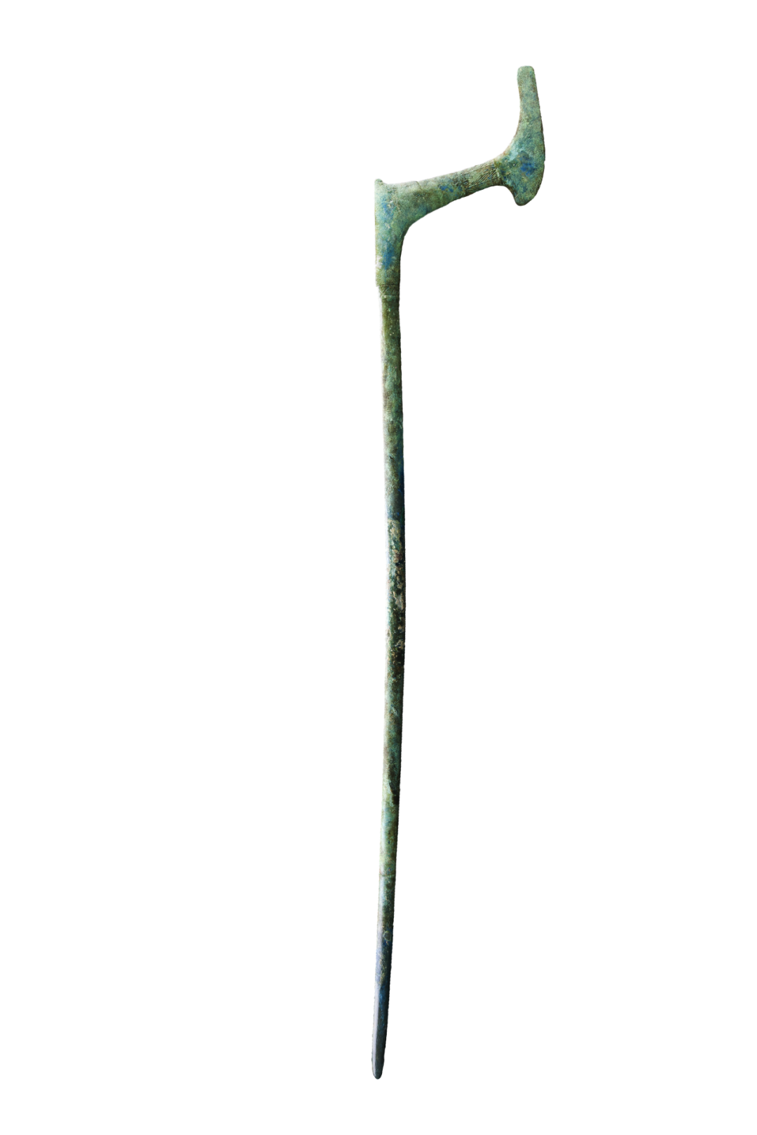 权杖由钺和柄两部分组成,钺部不对称靴形刃上饰有精细的几何纹饰,与实心长柄的銎部相连,柄底端较尖,断面为椭圆形。此权杖形制特殊,制作精美,可能是特殊的仪仗器,是社会上重要的政治人物所拥有。