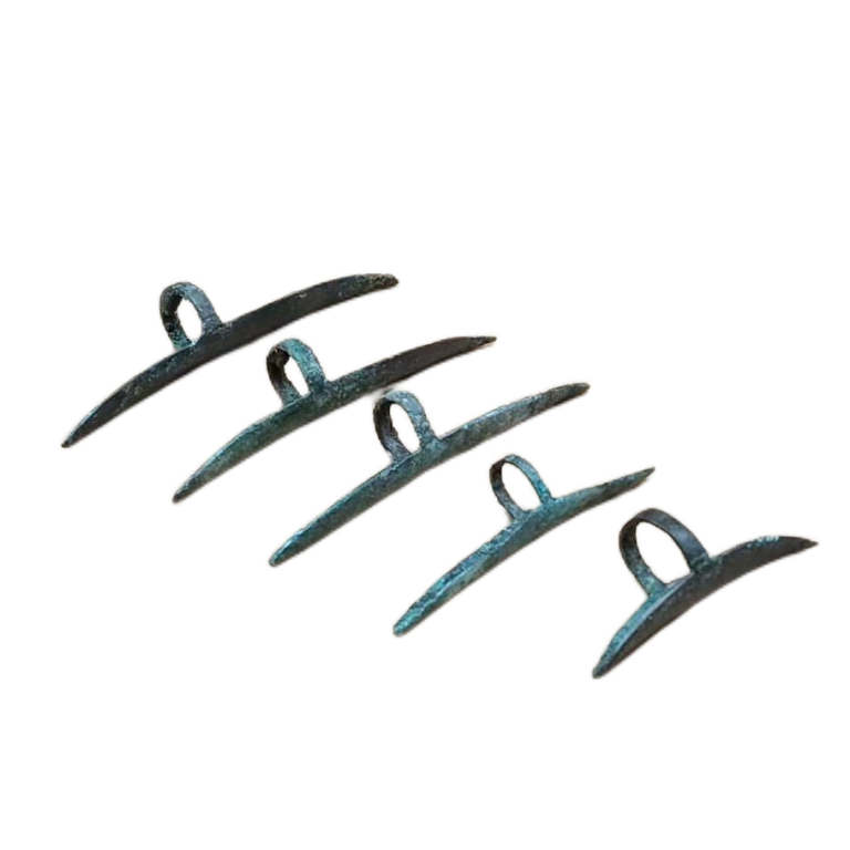 每只整体似船型,两端尖锐,中间有一环钮,断面为圆形。与成年人左右手十指造型相仿,应是戴在手上保护手指之用,装饰功能多于实用功能。