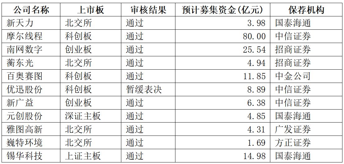 Wind数据显示,今年9月,A股IPO市场共迎来12家公司首发上会,包括来自沪深主板的锡华科技、元创股份、中国铀业,创业板的南网数字、新广益,科创板的百奥赛图、优迅股份、摩尔线程,以及来自北交所的新天力、蘅东光、雅图高新和巍特环境,这一首发上会数量续创去年2月份以来的月度新高。