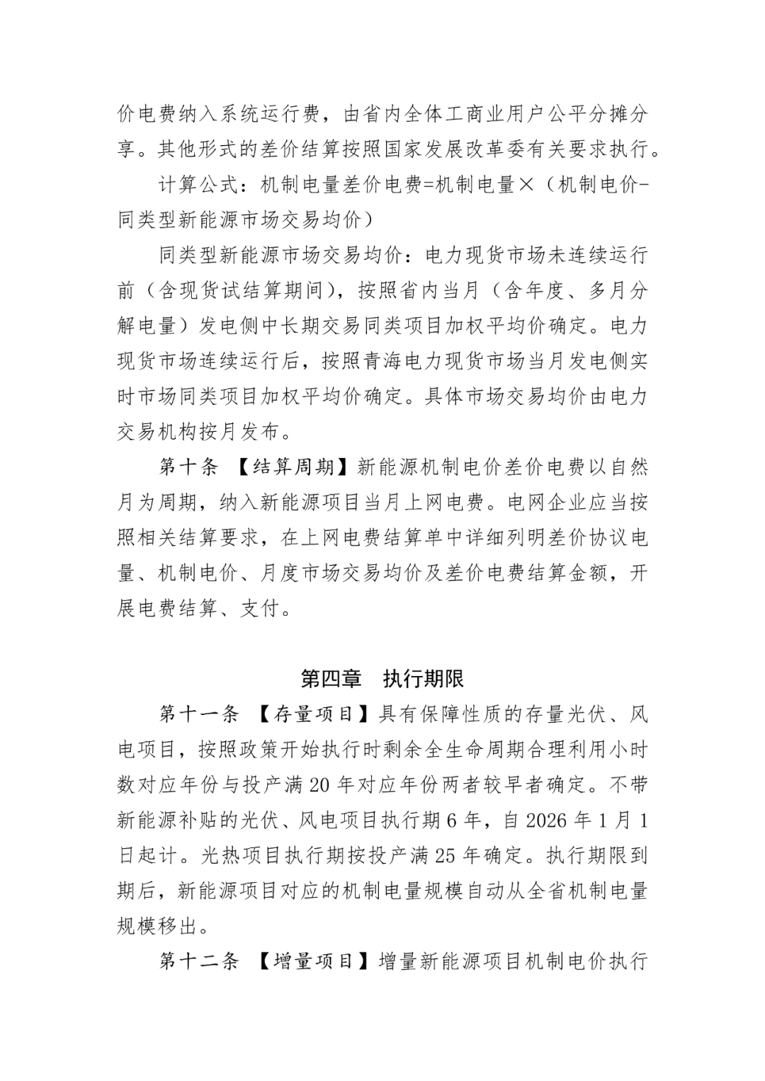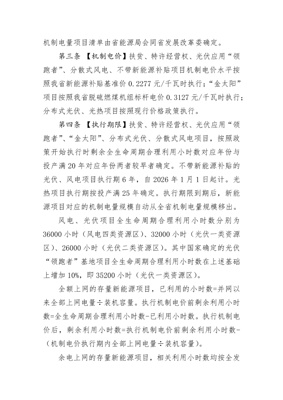 执行期限:扶贫、特许经营权、光伏应用“领跑者”、“金太阳”、分布式光伏、分散式风电项目,按照政策开始执行时剩余全生命周期合理利用小时数对应年份与投产满20年对应年份两者较早者确定。不带新能源补贴的光伏、风电项目执行期6年,自2026年1月1日起计。光热项目执行期按投产满25年确定。执行期限到期后,新能源项目对应的机制电量规模自动从全省机制电量规模移出。