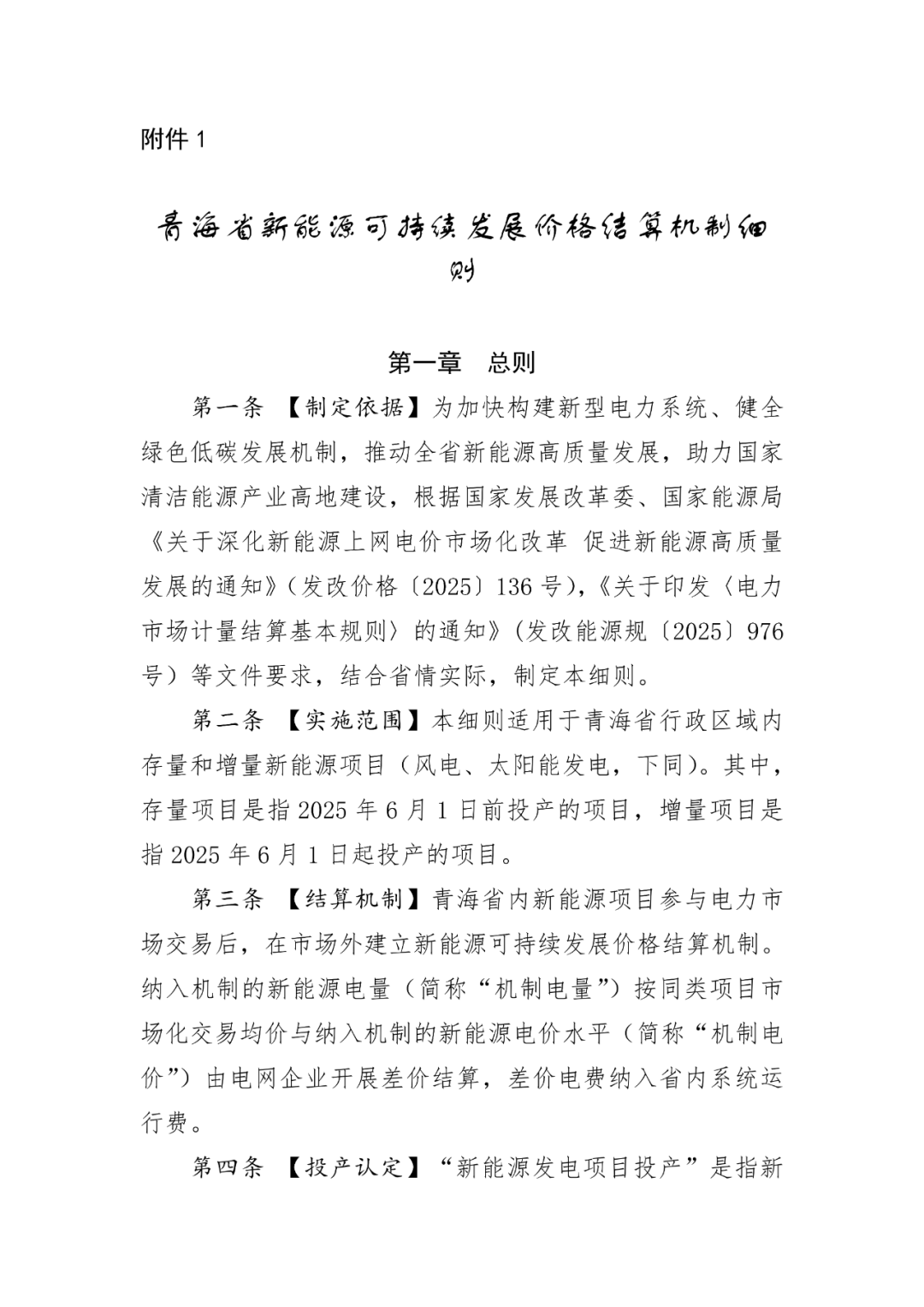 为全面贯彻党中央、国务院关于加快构建新型电力系统、健全绿色低碳发展机制决策部署,更好适应新时代能源电力高质量发展要求,健全完善充分反映市场供需的上网电价形成机制,持续增强市场价格对新能源发展的引导作用,有效解决制约能源电力改革和发展中的深层次矛盾,为青海清洁能源产业高地建设注入新动能,根据国家发展改革委、国家能源局《关于深化新能源上网电价市场化改革促进新能源高质量发展的通知》(发改价格〔2025〕136号),《关于印发〈电力市场计量结算基本规则〉的通知》(发改能源规〔2025〕976号)等文件要求,结合省情实际,制定本实施方案。