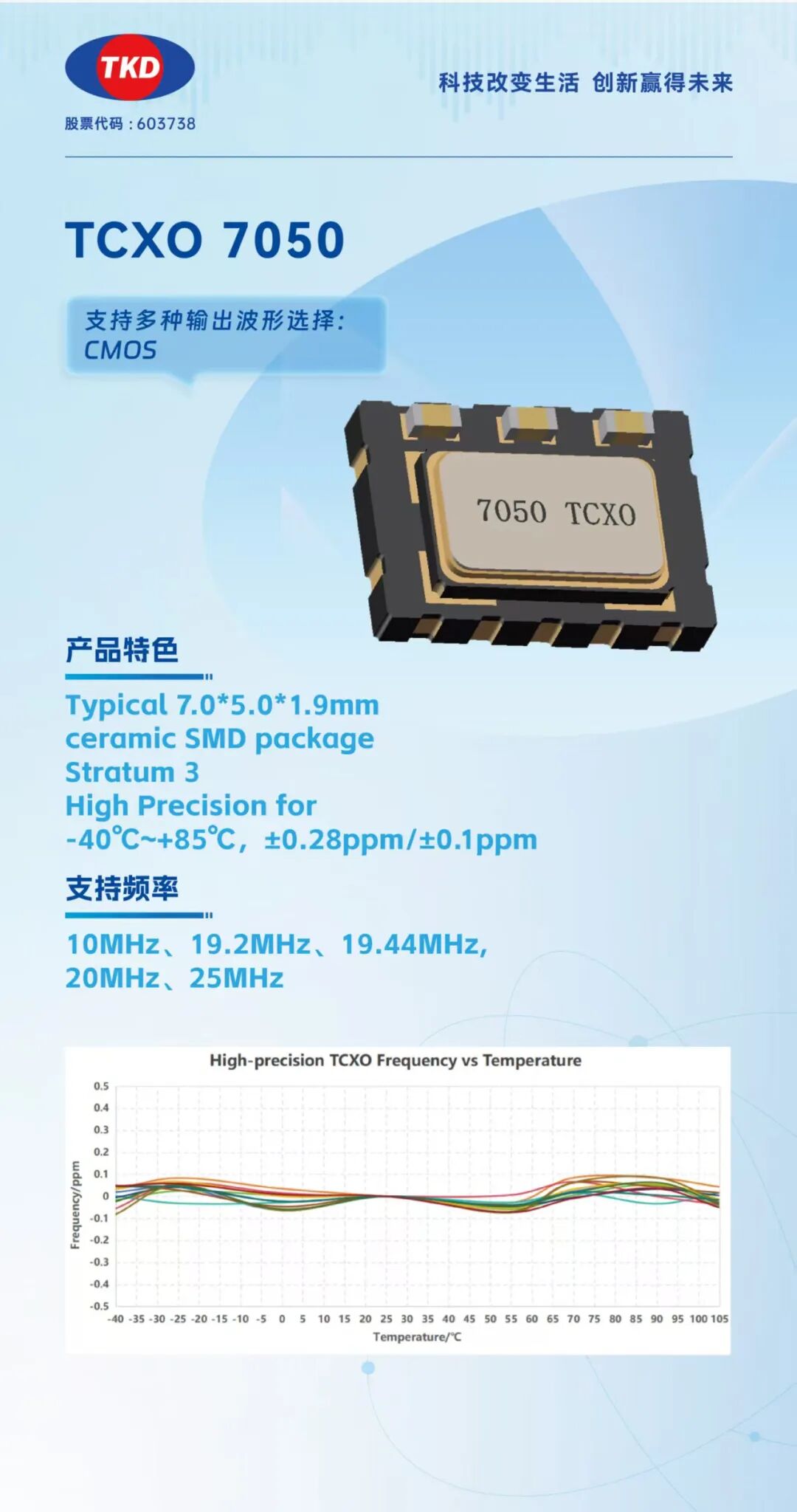 ●高稳定度TCXO(温度补偿晶振): 确保设备在复杂环境下依然保持卓越的频率稳定性,是通信基站、导航定位及精密测量设备的“心跳”,为其在复杂工况下提供始终如一的精准时钟信号,保障系统终极可靠。