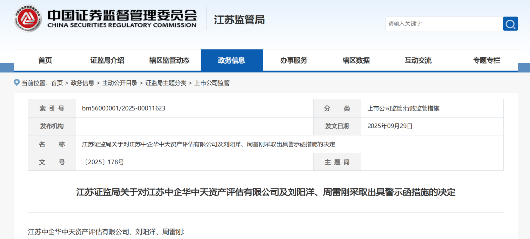 江苏证监局关于对江苏中企华中天资产评估有限公司及刘阳洋、周雷刚采取出具警示函措施的决定