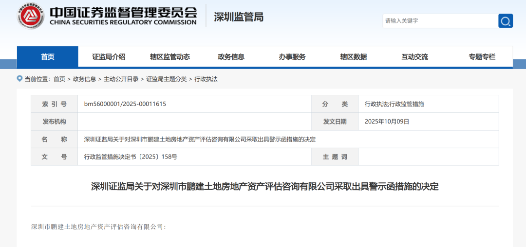深圳证监局关于对深圳市鹏建土地房地产资产评估咨询有限公司采取出具警示函措施的决定