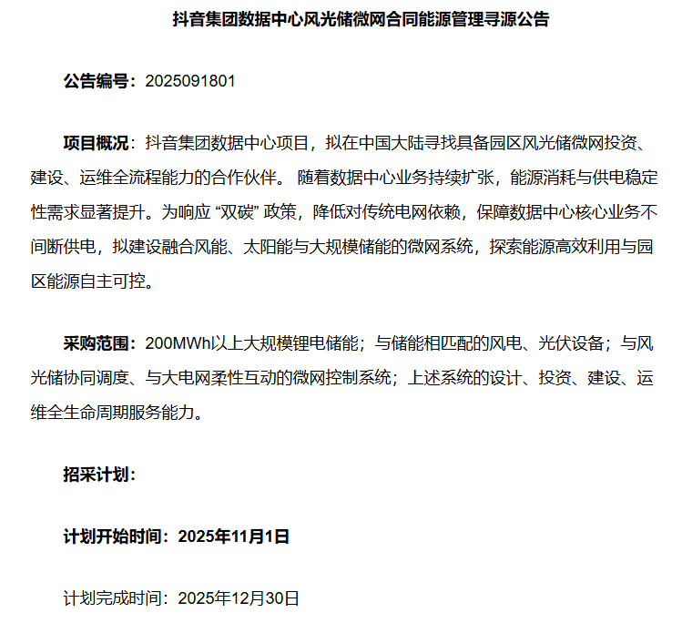 大型互联网公司正从传统的“电力消费者”向“能源基础设施参与者”转型,主动布局可再生能源和储能系统。2025年9月,抖音集团发布了其数据中心“风光储微网”合同能源管理寻源公告,拟采购200 MWh以上的大规模锂电储能系统,并配套风电、光伏设备与微网控制系统,以实现风光储能协同调度和对外电网的柔性互动。业内评论认为,此举在互联网行业具有里程碑意义:一方面表明大型互联网公司正从被动的电力用户转变为积极的能源管理者和贡献者;另一方面也意味着“风光储微网”解决方案将成为未来算力基础设施建设的标配选项之一。