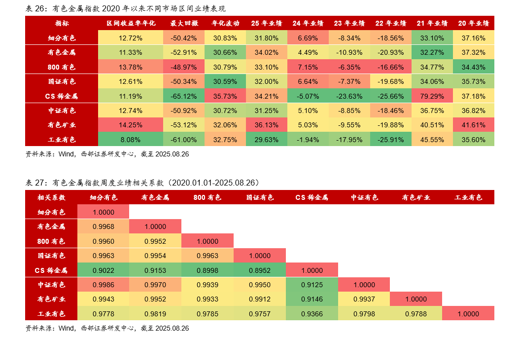 从相关系数来看,仅CS稀金属与800有色、国证有色的相关系数在0.9以下,其余指数相关系数均在0.9以上,细分有色、有色金属、国证有色、800有色、中证有色、有色矿业的相关系数均在0.99以上。