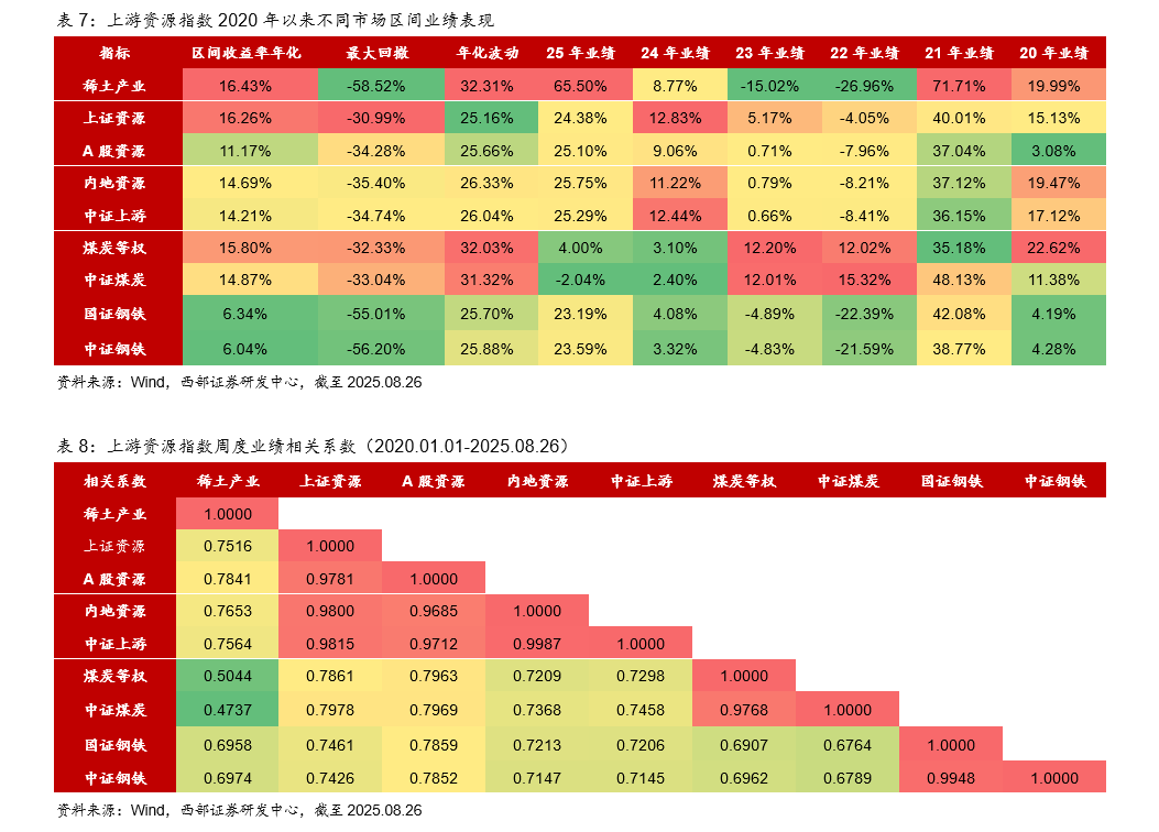 区间年化收益率上(2020.01.01-2025.08.26,下同),稀土产业、上证资源和煤炭等权表现较好。25年以来(截至2025.08.26,下同)、21年为稀土产业大幅领先,24年上证资源、中证上游、内地资源表现占优,22年、23年为煤炭等权和中证煤炭表现较好。