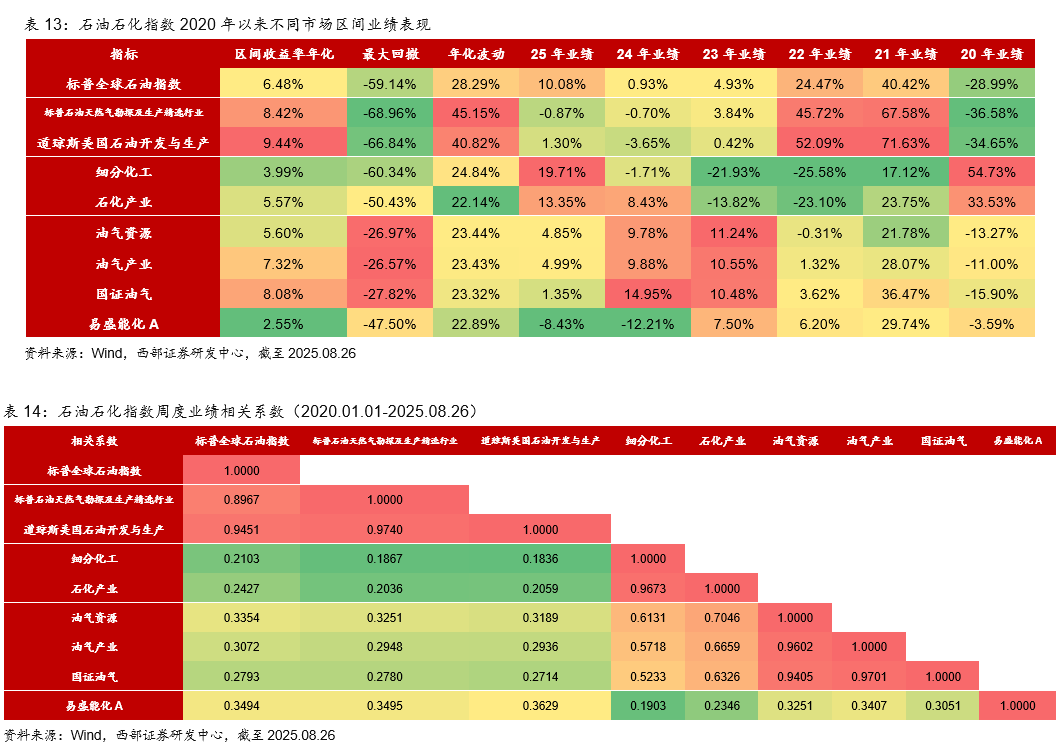 区间年化收益率上(2020.01.01-2025.08.26),道琼斯美国石油开发与生产、标普全球石油指数和国证油气表现较好,道琼斯美国石油开发与生产在21年、22年业绩均为最佳。25年以来,细分化工表现最好,其次为石化产业。