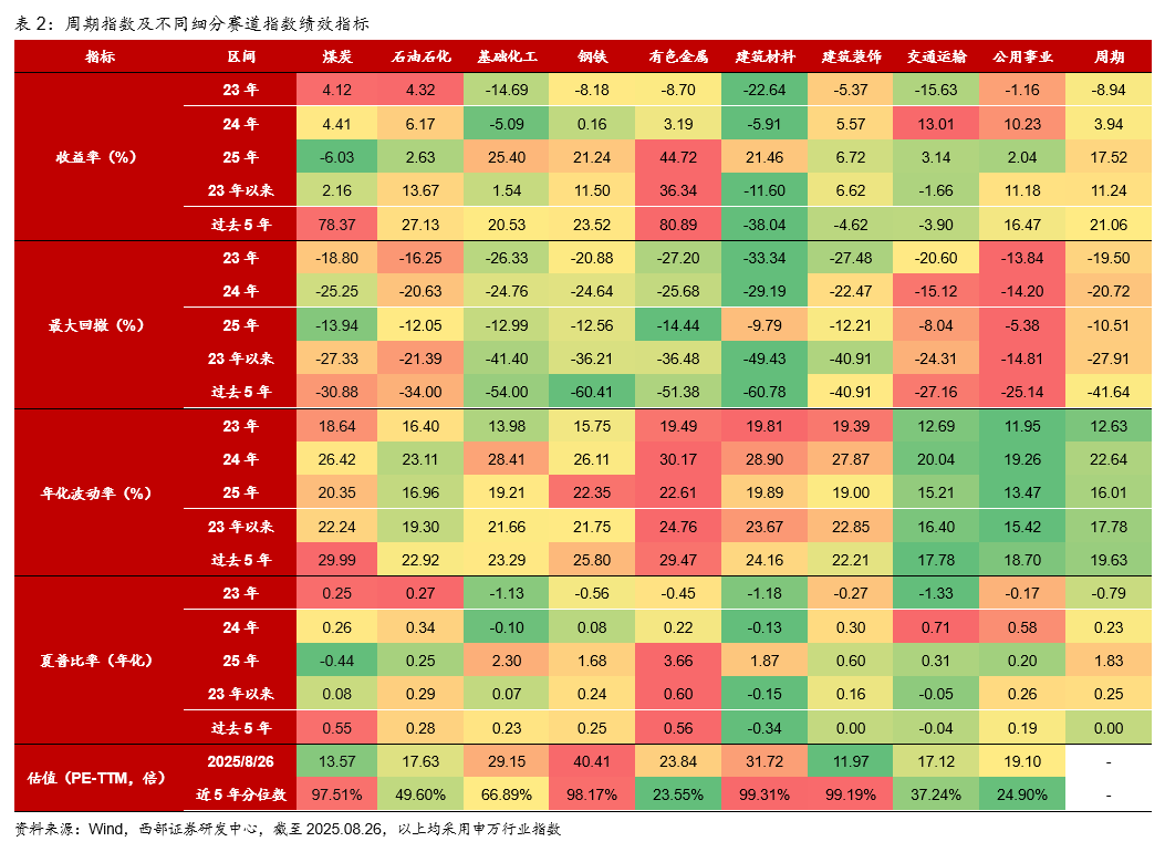 从区间收益率、最大回撤、年化波动率、夏普比率、估值(PE-TTM)等角度对比不同细分领域的周期行业指数:1)从年度收益率来看,23年、24年表现居前的为石油石化、交通运输,25年以来(截至2025.08.26,下同)有色金属、基础化工、建筑材料表现较好。2)从夏普来看,过去5年,煤炭、有色金属较突出。3)从估值来看,钢铁、建筑材料估值较高且处于近5年分位数98%以上;煤炭、建筑装饰估值在15倍以内,但处于近5年分位数97%以上;有色金属、公用事业、交通运输估值处于相对低位。