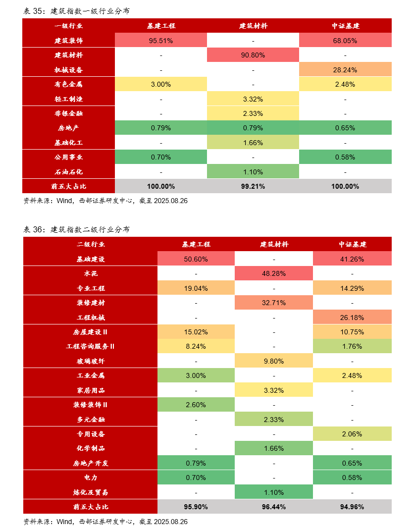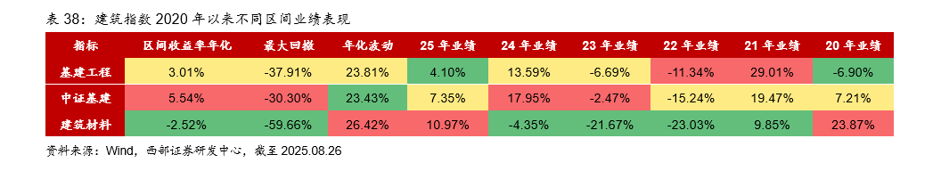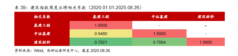 区间年化收益率上(2020.01.01-2025.08.26),中证基建相对较好。21年、22年基建工程表现居前;23年、24年中证基建表现亮眼;建筑材料在20年、25年以来表现突出。从相关系数来看,基建工程与中证基建、建筑材料指数的相关系数分别为0.95、0.70。