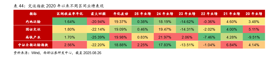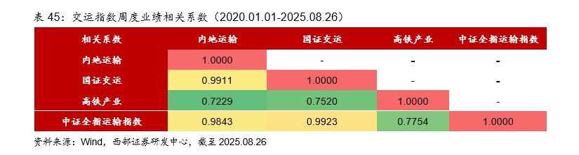 区间年化收益率上(2020.01.01-2025.08.26),4个指数差别不大。25年以来,中证全指运输指数较好。相关系数上,高铁产业与其他3个指数相关系数在0.72-0.78之间。