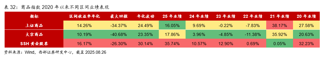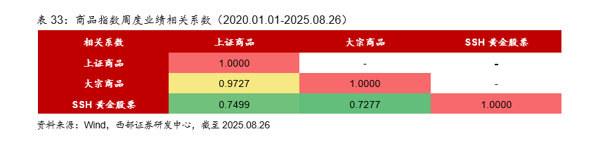 区间年化收益率上(2020.01.01-2025.08.26),上证商品、大宗商品、SHH黄金股票分别为14.26%、10.19%、16.17%。SHH黄金股票在20年、22年、23年、24年、25年以来,均表现最好;上证商品21年表现亮眼。从相关系数来看,上证商品与大宗商品、SHH黄金股票的相关系数分别为0.97、0.75。