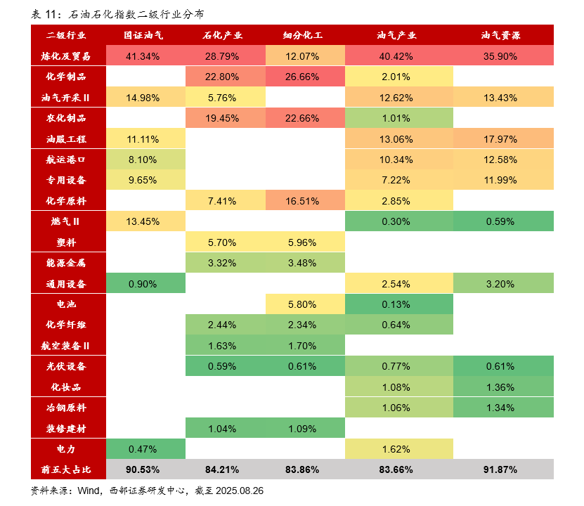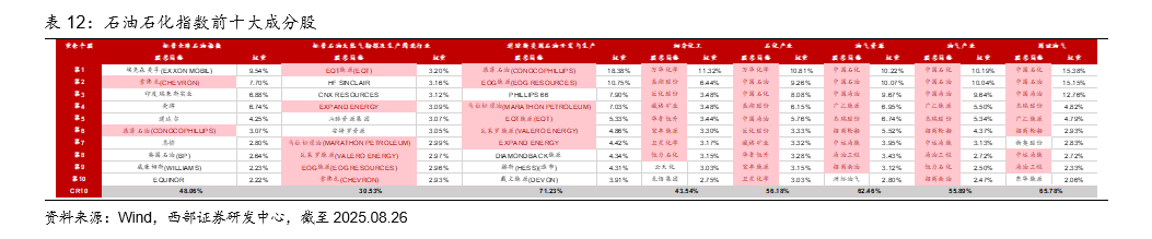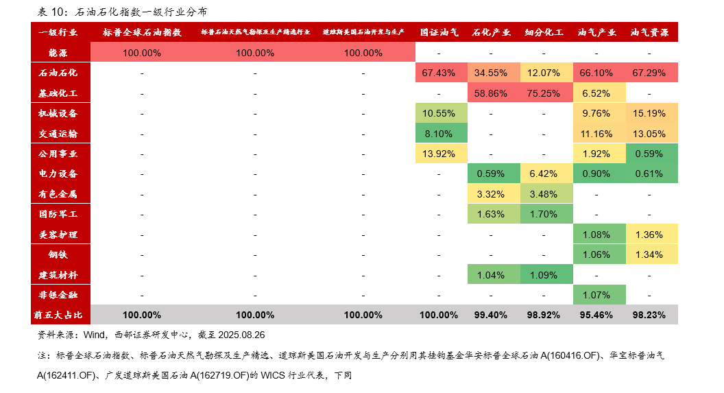 从行业分布来看,标普全球石油指数、标普石油天然气勘探及生产精选行业和道琼斯美国石油开发与生产集中于能源,能源占比均达100%;国证油气、油气产业和油气资源主要行业为石油石化,占比分别为67.43%、66.10%、67.29%,细分主要为炼化及贸易、油气开采和油服工程;石化产业和细分化工主要在基础化工和石油石化,其中石化产业在炼化及贸易上占比较高,细分化工在化学制品、农化制品和化学原料上占比较高。