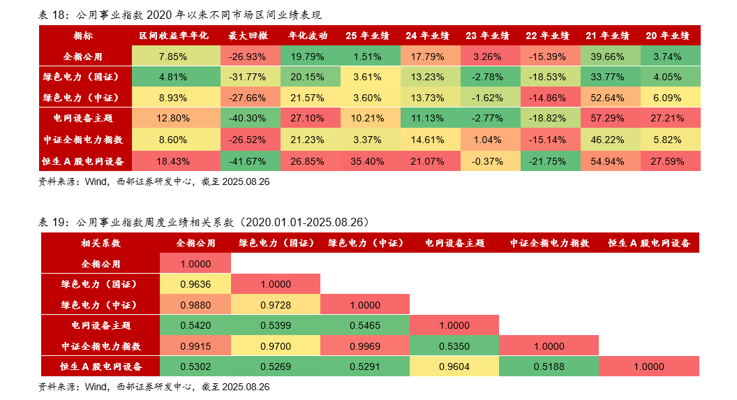 区间年化收益率上(2020.01.01-2025.08.26),恒生A股电网设备表现亮眼,该指数在20年、24年和25年以来业绩均为最佳。从相关系数来看,电网设备主题与恒生A股电网设备相关系数为0.96,这两个指数与其余指数的相关系数均在0.5-0.6之间,相对较低;其余指数的相关系数均在0.96以上。