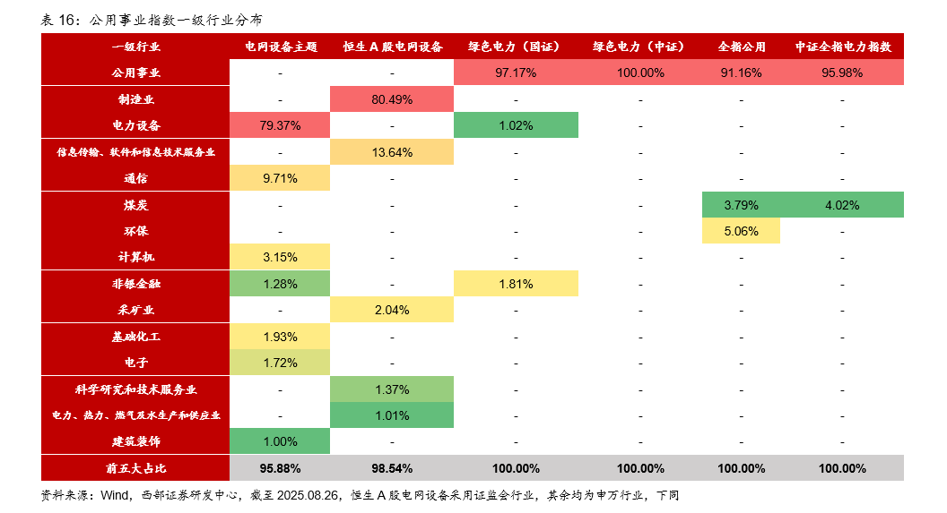从行业分布来看,绿色电力(国证)、绿色电力(中证)、全指公用和中证全指电力指数以公用事业为核心,公用事业占比均超过90%,其中绿色电力(中证)达到100%,主要为电力;电网设备主题聚焦于电力设备,主要为电网设备;恒生A股电网设备集中在制造业(证监会行业)。