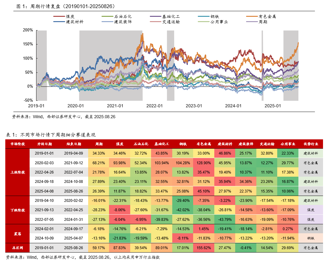 2019年以来(截至2025.08.26),根据周期(代码801271.SI)指数走势,划分为5个上涨、3个下跌、2个震荡市场区间。从不同市场阶段来看:1)总区间内,周期指数上涨59.17%,有色金属表现最好,业绩为155.62%;其次为基础化工,上涨89.01%。不同细分领域分化较大,表现最好的有色金属相对表现最差的建筑装饰,超额业绩达156.04%。2)不同区间内,20190101-20190409、20240918-20241008,这2个上涨区间均为建筑材料表现最好,分别上涨46.86%、35.94%;20200203-20210912、20220426-20220704、20250408-20250826,这3个上涨区间均为有色金属领先,分别上涨128.90%、35.47%、45.10%。20210913-20220425、20220705-20240131,这两个区间煤炭表现最好,其余震荡和下跌区间表现占优的为建筑材料、有色金属和钢铁。整体来看,有色金属、建筑材料、煤炭、钢铁占优行情分别为4次、3次、2次、1次,其余行业各区间表现均不突出。3)在不同市场环境中,周期细分领域表现差异相对较大。将每个区间内9个一级行业指数涨跌幅分化超25%认定为“板块分化程度高”,有6个区间板块分化程度高,占比达60.00%。