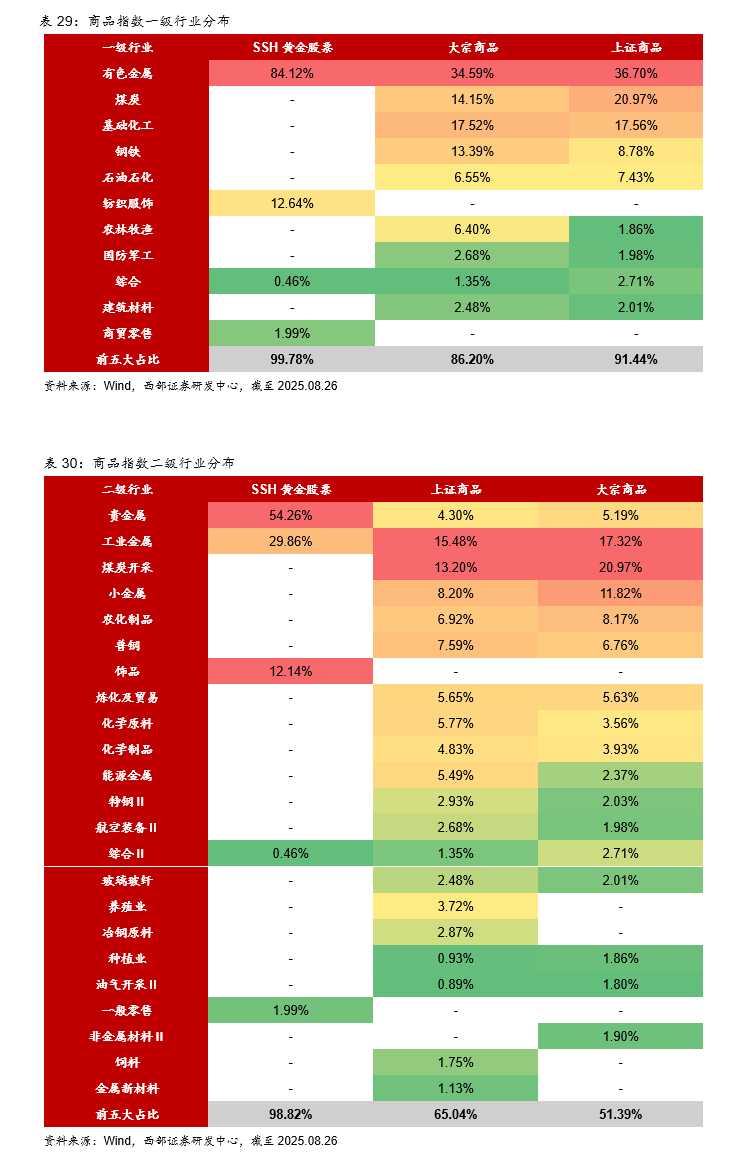 从一级行业来看,1)SSH黄金股票、大宗商品、上证商品的第一大行业均为有色金属,占比分别为84.12%、34.59%、36.70%。2)SSH黄金股票的第二大行业为纺织服饰(12.64%),其余占比均在10%以内;大宗商品占比10%以上的行业还包括基础化工(17.52%)、煤炭(14.15%)、钢铁(13.39%);上证商品占比10%以上的行业还包括煤炭(20.97%)、基础化工(17.56%)。3)大宗商品和上证商品在煤炭、基础化工、钢铁和石油石化均有分布,SSH黄金股票则没有。从二级行业来看,1)3个指数均有的行业为工业金属、贵金属、综合Ⅱ。2)SSH黄金股票、大宗商品、上证商品的第一大行业分别为贵金属(54.26%)、工业金属(15.48%)、煤炭开采(20.97%)。