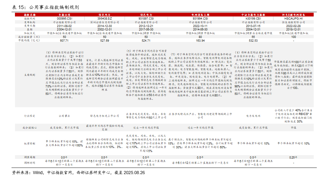对比这6只指数的编制特点,1)选股范围均为A股。2)成分股数量均不超100只。3)样本的选取关注业务范围、总市值,成交金额等。4)均设置了单个样本权重限制或其他权重限制。全指公用单个样本权重限制为15%,中证全指电力指数、恒生A股电网设备单个样本权重限制为10%,绿色电力(国证)根据绿色电力业务占比将样本分为两档,权重上限分别为10%、3%,绿色电力(中证)要求绿色电力(光伏发电、风电、水电、火电、核电)业务占比超过10%的单个样本权重不超过10%、其他单个样本权重不超5%,电网设备主题要求属于特高压、智能电网领域的单个样本权重不超过15%。此外,全指公用和电网设备主题限定前五大样本权重合计不超过60%。4)调样周期上,恒生A股电网设备为每季,其余均为半年。