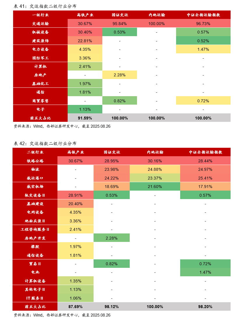 从一级行业来看,1)国证交运指数、内地运输指数、中证全指运输指数在交通运输上的占比分别为95.84%、100%、96.73%。高铁产业主要为交通运输(30.67%)、机械设备(30.40%)、建筑装饰(22.81%)。从二级行业来看,内地运输、国证交运、中证全指运输指数的前三大行业为铁道公路、物流、航运港口,高铁产业的前三大行业为铁路公路、轨交设备、基础建设。