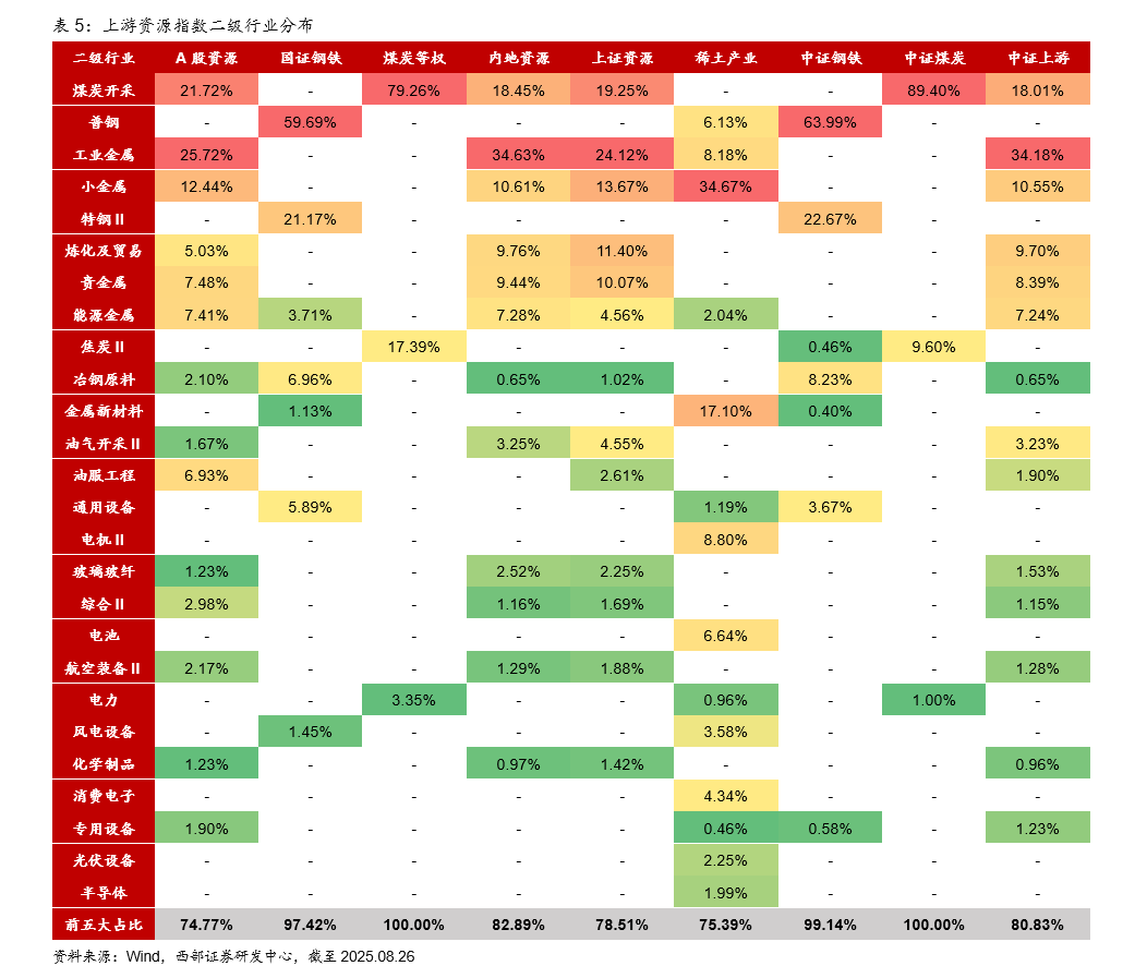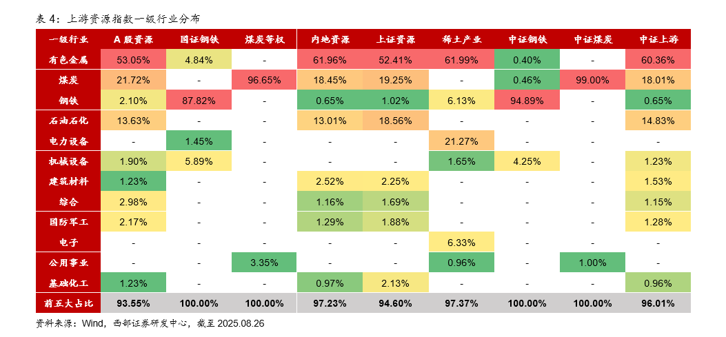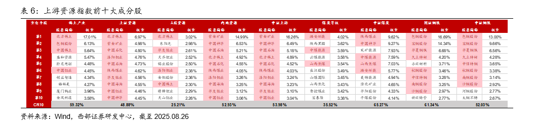 从行业分布来看,A股资源、内地资源、上证资源、稀土产业和中证上游的主要行业为有色金属,细分为工业金属、小金属、贵金属和能源金属;国证钢铁和中证钢铁聚焦于钢铁,主要为普钢、特钢和冶钢原料;煤炭等权和中证煤炭聚焦于煤炭,煤炭占比均超过95%,行业集中度较高,细分来看主要是煤炭开采和焦炭。