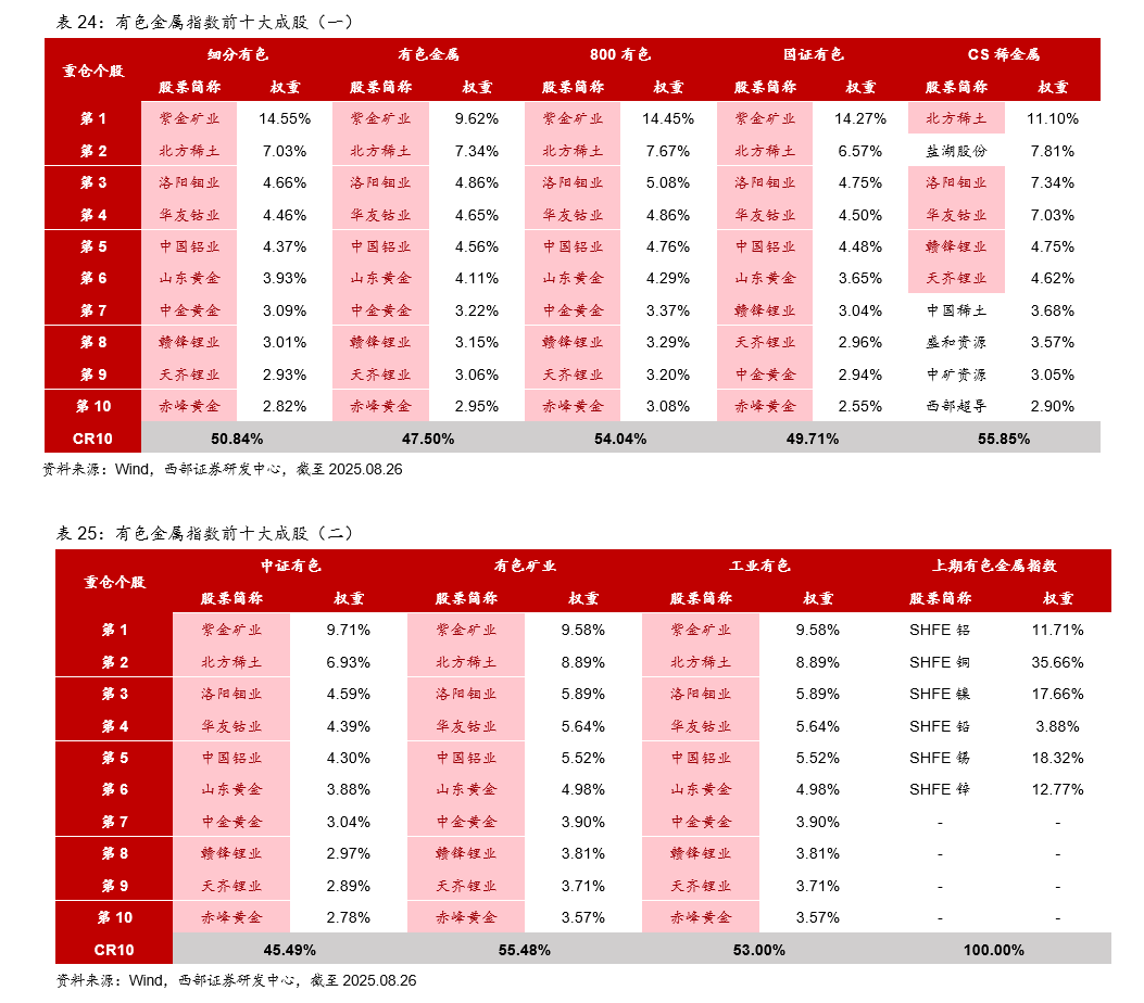 从前十大成分股来看,细分有色、有色金属、800有色、国证有色、中证有色、工业有色和有色矿业完全重合,包括紫金矿业、北方稀土、洛阳钼业、华友钴业、中国铝业、山东黄金、中金黄金、赣锋锂业、天齐锂业和赤峰黄金。CS稀金属与其他指数成分股差别较大。