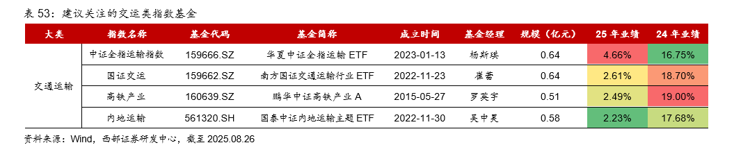 在此基础上,建议关注:1)华夏中证全指运输ETF;2)南方国证交通运输行业ETF;3)鹏华中证高铁产业A;4)国泰中证内地运输主题ETF。