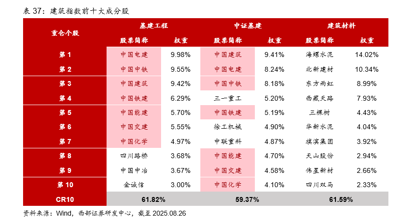 从前十大成分股来看,基建工程与中证基建有7只个股相同,包括中国电建、中国中铁、中国建筑、中国铁建、中国能建、中国交建、中国化学。建筑材料与其他指数不同。