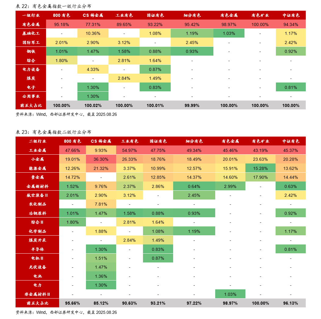 从一级行业来看,有色金属指数前5大行业集中度均在95%以上。1)8只指数的第一大行业均为有色金属,在有色金属占比上,有色矿业>有色金属>800有色>细分有色>中证有色>国证有色>工业有色>CS稀金属,其中有色矿业占比达100%,CS稀金属占比在77%以上。2)CS稀金属的第二大行业为基础化工,占比为10.36%;800有色、工业有色、国证有色、细分有色和中证有色的第二大行业均为国防军工,占比不超过5%;国证有色的第二大行业为综合,占比为1.64%。从二级行业来看,有色金属指数前5大行业集中度均在85%以上。1)8个指数均有的行业为工业金属、小金属、能源金属。2)800有色、工业有色、国证有色、细分有色、有色金属、有色矿业、中证有色的第一大行业均为工业金属,占比均在40%以上,其中工业有色最高(54.97%);CS稀金属的第一大行业为小金属(36.30%)。