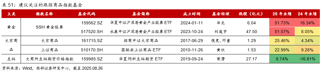 每类商品资产,均具有其配置逻辑和价值。建议关注:1)华夏、永赢的中证沪深港黄金产业股票ETF;2)招商中证大宗商品;3)国联安上证商品ETF;4)华夏饲料豆粕期货ETF;5)华夏饲料豆粕期货ETF联接A。