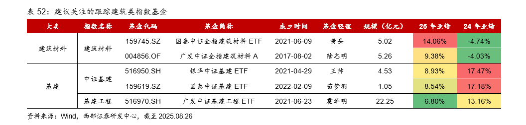 在此基础上,建议关注:1)国泰中证全指建筑材料ETF、广发中证全指建筑材料A;2)银华、国泰的中证基建ETF;3)广发中证基建工程ETF。