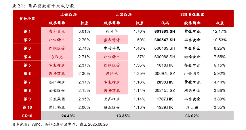 从前十大成分股来看,大宗商品和上证商品重合度较高,主要有盛和资源、北方稀土、包钢股份、东阳光、华友钴业和潞安环能。SSH黄金股票指数,同时包含A股和港股的紫金矿业、山东黄金,A+H合计占比为16.61%、14.33%。