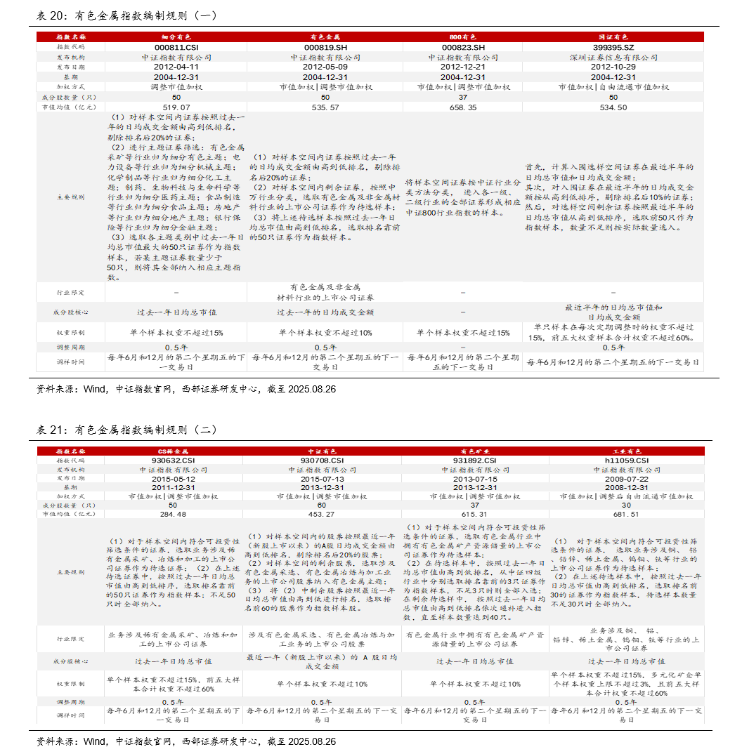 上期有色为期货指数,暂不考虑。对比8只指数的编制特点,1)选股范围方面,均为A股。2)成分股数量上,仅中证有色为60只,其余在50只以内。3)样本的选取关注业务范围、日均总市值、日均成交金额等。4)均设置了单个样本权重限制或者其他权重限制,有色金属、中证有色、有色矿业单个样本不超10%,其余指数单样本不超15%(工业有色中多元矿金单样本不超3%)。此外,工业有色、CS稀金属、国证有色要求前五大权重合计不超60%。5)调样周期上,均为半年。