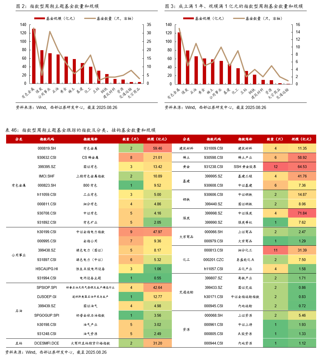 从产品布局上看,周期类指数基金较少,仍有较大发展空间。截至2025年8月26日,指数型周期主题基金共计160只,规模合计647.97亿元,跟踪44只指数。成立满1年、规模不小于1亿元的产品共计82只,规模合计605.51亿元。跟踪有色金属的基金最多、规模最大。