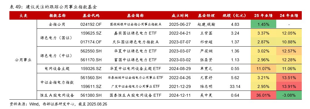 跟踪公用事业指数的基金,建议关注:1)国投瑞银中证全指公用事业指数A;2)嘉实国证绿色电力ETF和天弘国证绿色电力指数A;3)华夏、富国的绿色电力(中证)ETF;4)华夏的电网设备主题ETF;5)华泰柏瑞、广发的中证全指电力指数的ETF;6)国泰恒生A股电网设备ETF。