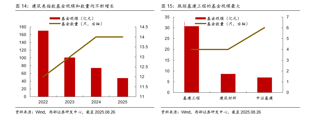 2022年末,建筑类指数基金仅12只,规模为171.00亿元。截至2025.08.26,数量增长至14只,规模减少为48.52亿元。