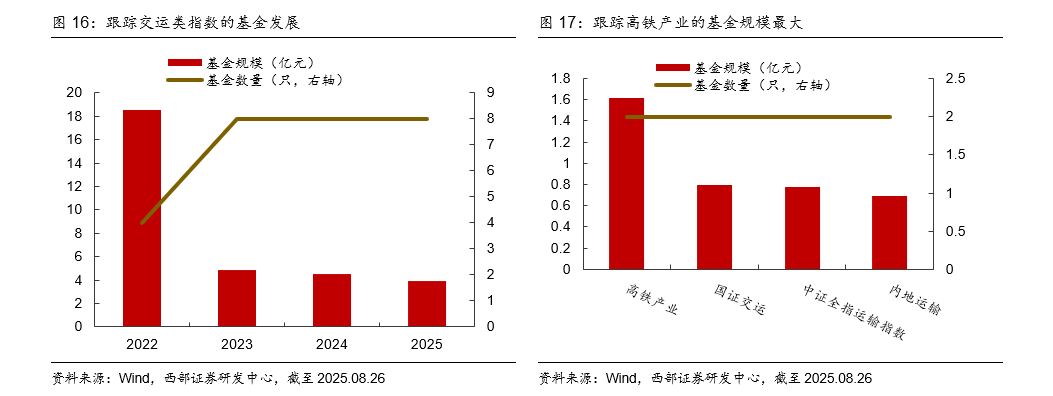 2022年末,跟踪交运类指数的基金仅4只,规模为18.55亿元。截至2025.08.26,数量增长至8只,规模减少至3.88亿元。